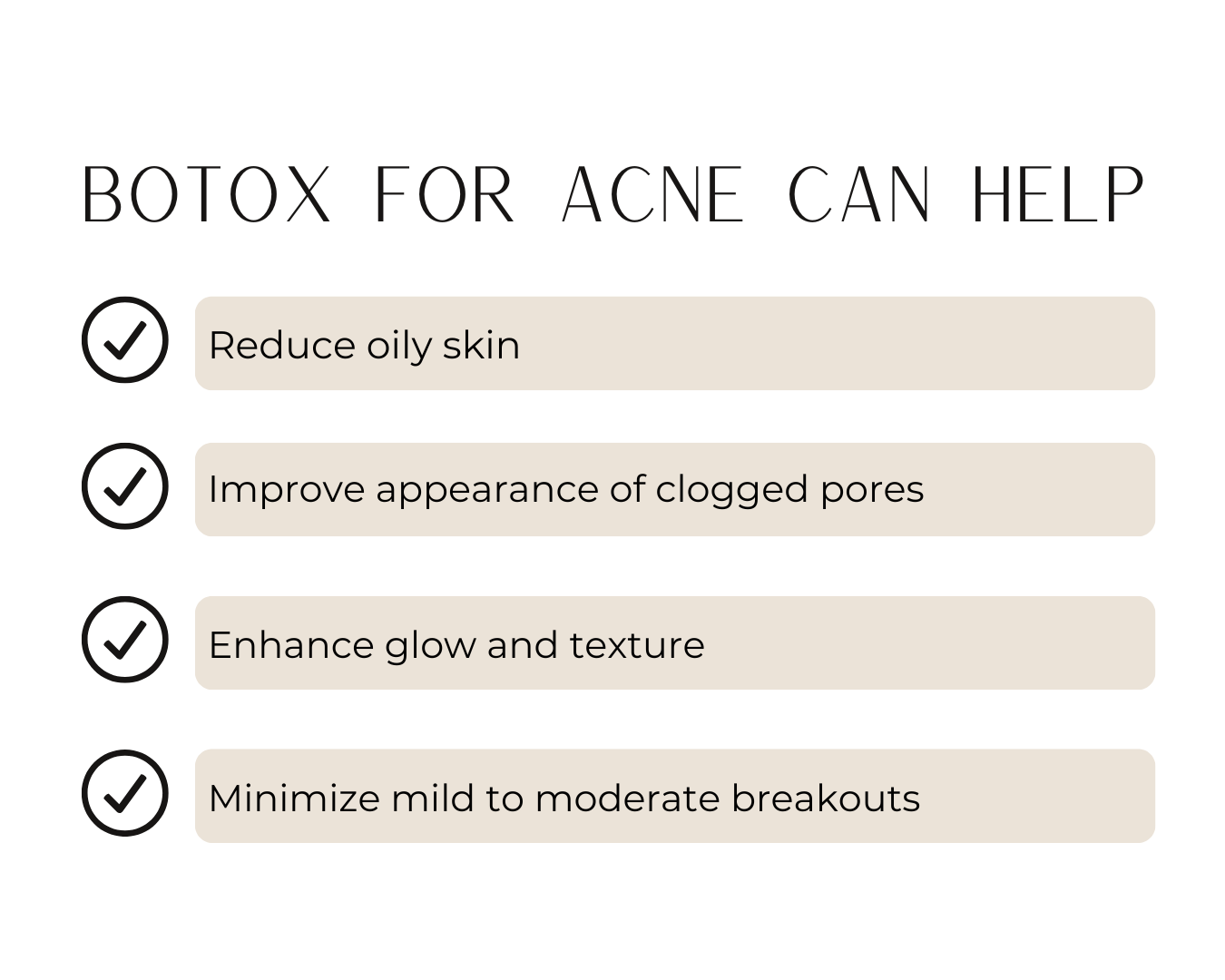 Acne is often driven by increased sebum production, which clogs pores, traps bacteria, and leads to breakouts. By reducing sebum secretion, Botox may help prevent clogged pores, minimize facial skin oily seborrhea, and interrupt the acne cycle at the source.